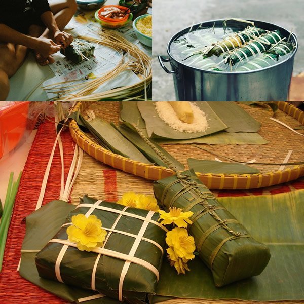 Wie an Ostern bei uns der Forsythiestrauß, so schmückt man in Việt Nam ebenfalls Sträuße. Allerdings sind das im Süden Aprikosensträuße und im Norden Pfirsichsträuße, an die man gute Wünsche hängt. Zudem darf ein Mâm ngũ quả, eine Schale mit fünf Früchten auf dem Altar nicht fehlen. Dieser besteht traditionell regional abhängig aus unterschiedlichen Früchten, die alle eine andere Farbe haben sollten.